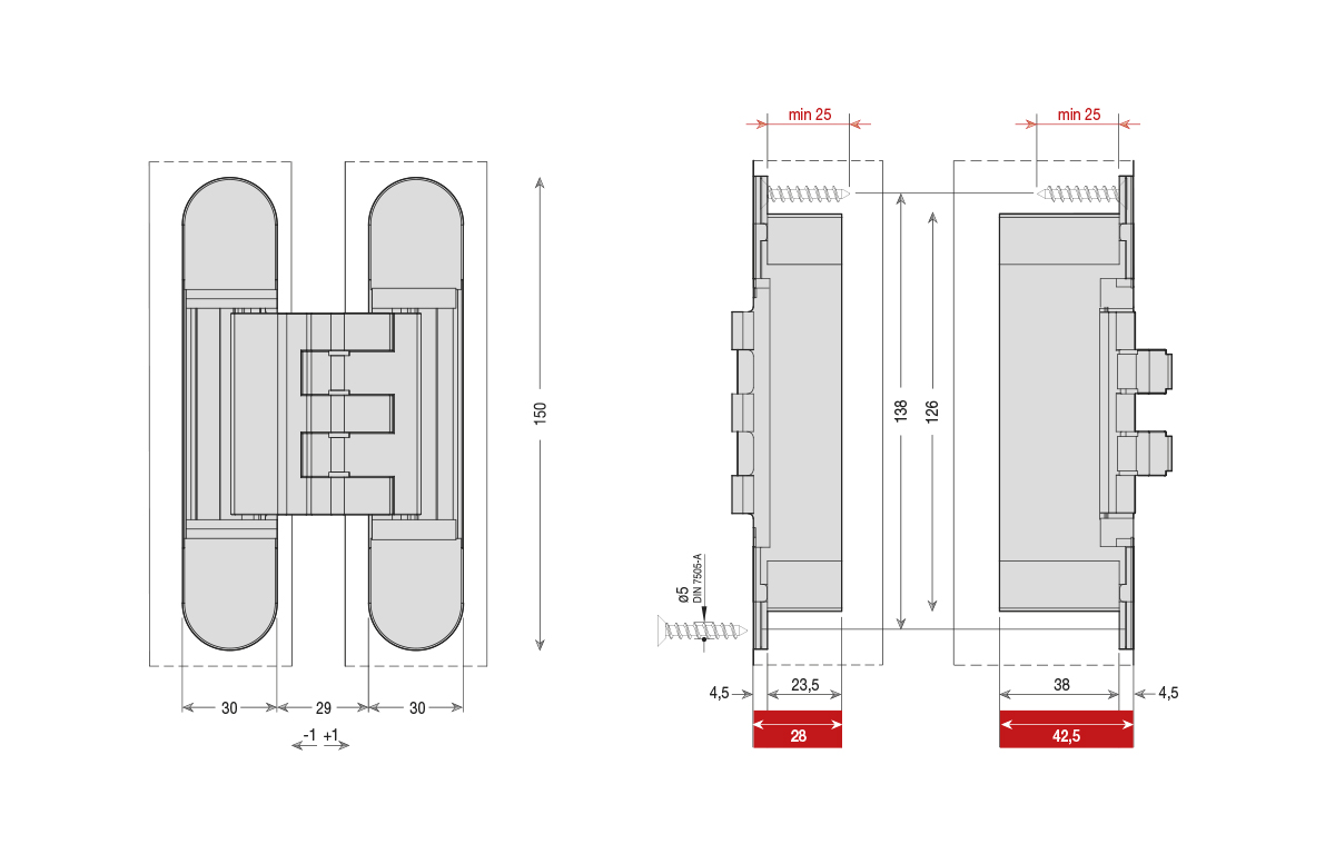 Das stärkste Offset-Scharnier auf dem Markt, 1418, ermöglicht die Installation von Verkleidungen bis zu 18 mm auf der Rahmen-/Wandseite und ist bis zu 100 kg belastbar.